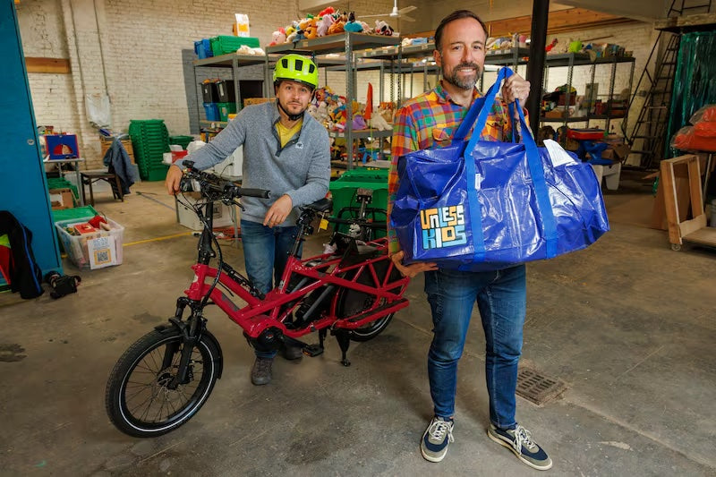 On a warm Monday afternoon in November, Alyssa Thomas opened the front door of her rowhouse in the Hawthorne neighborhood of South Philadelphia. Her two children weren’t home, but it was their delivery she was receiving. From a wheeled bin pulled by e-bike cyclist Blake Carroll emerged a stash of toys: Brain Flakes, rainbow-colored counting bears, and dominoes.