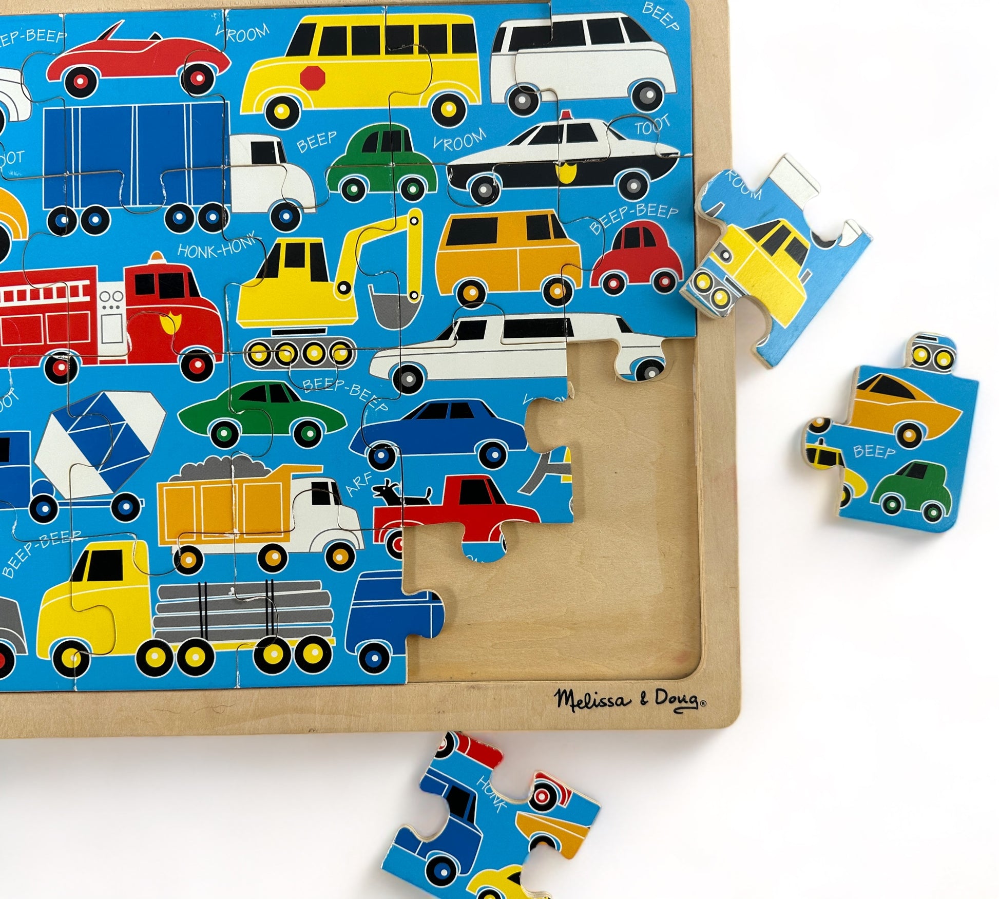 Rev up for a puzzle pit stop! This chunky 24-piece Melissa & Doug jigsaw features colorful cars and friendly faces. Perfect for little hands, it helps build problem-solving skills and gets imaginations racing!