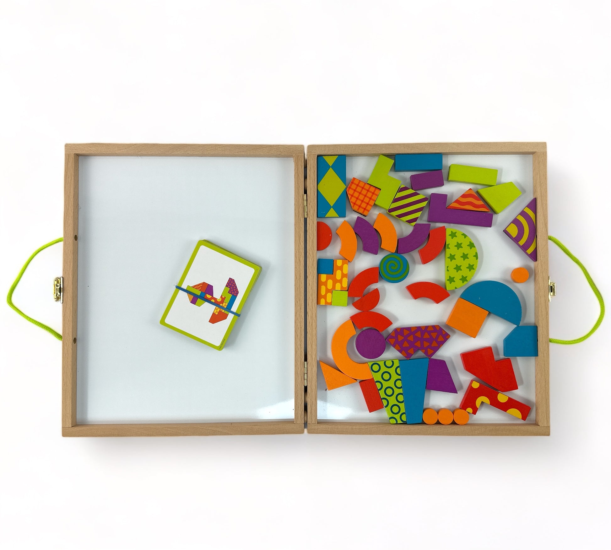 Calling all puzzle and pattern lovers! MindWare Imagination Patterns features colorful wooden shapes with cheerful patterns. Match and build silly animals, faces, and more with the included cards, or create your own free-play designs. It's a fun and colorful way to boost your child's creativity and fine motor skills!