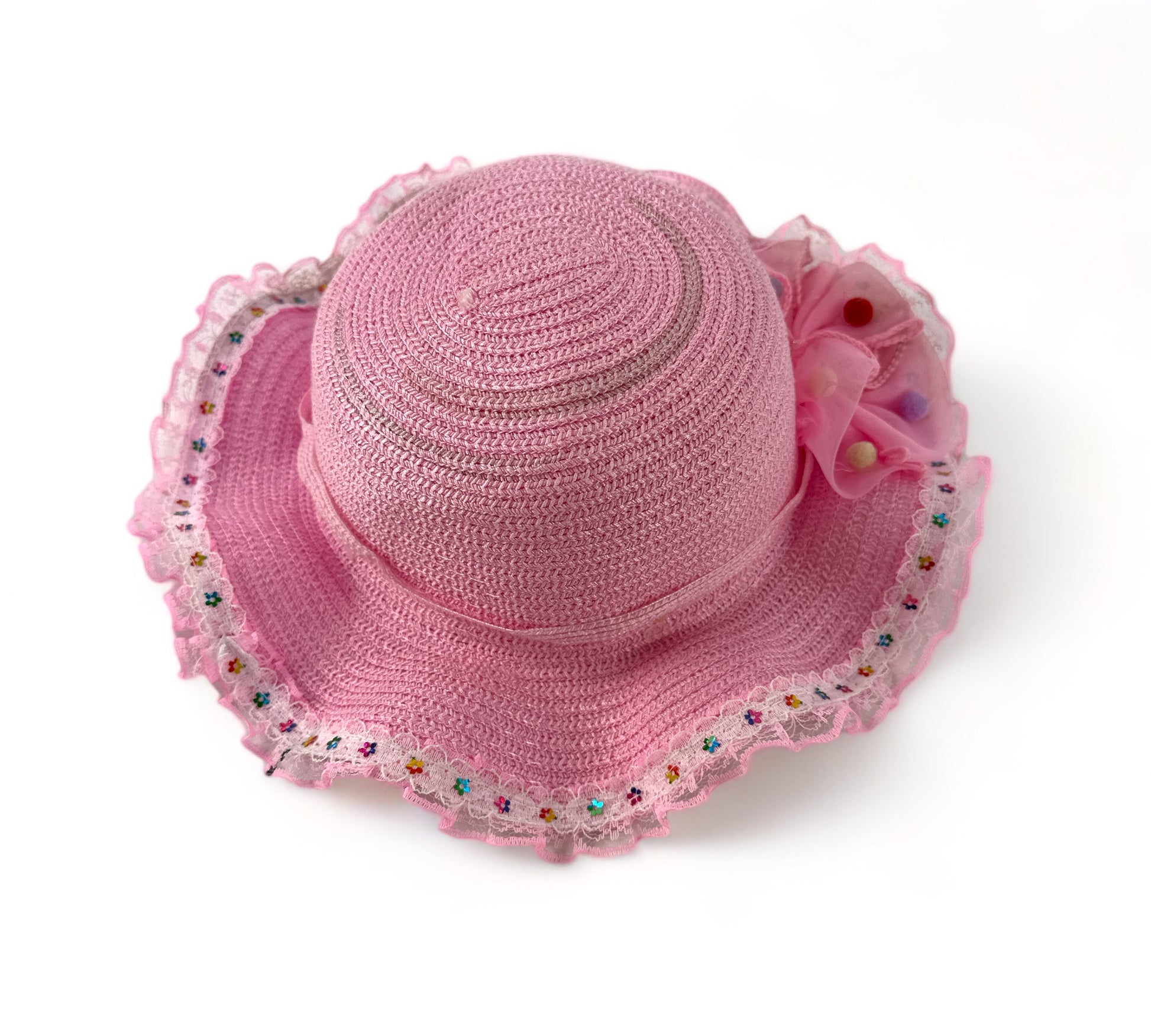 Sunshine, sparkles, and summertime fun! This pink straw hat with a bow is the perfect finishing touch for any pretend adventure. Whether it's a tea party on the lawn or a beach trip to the sandbox, this hat adds a touch of whimsy to playtime!