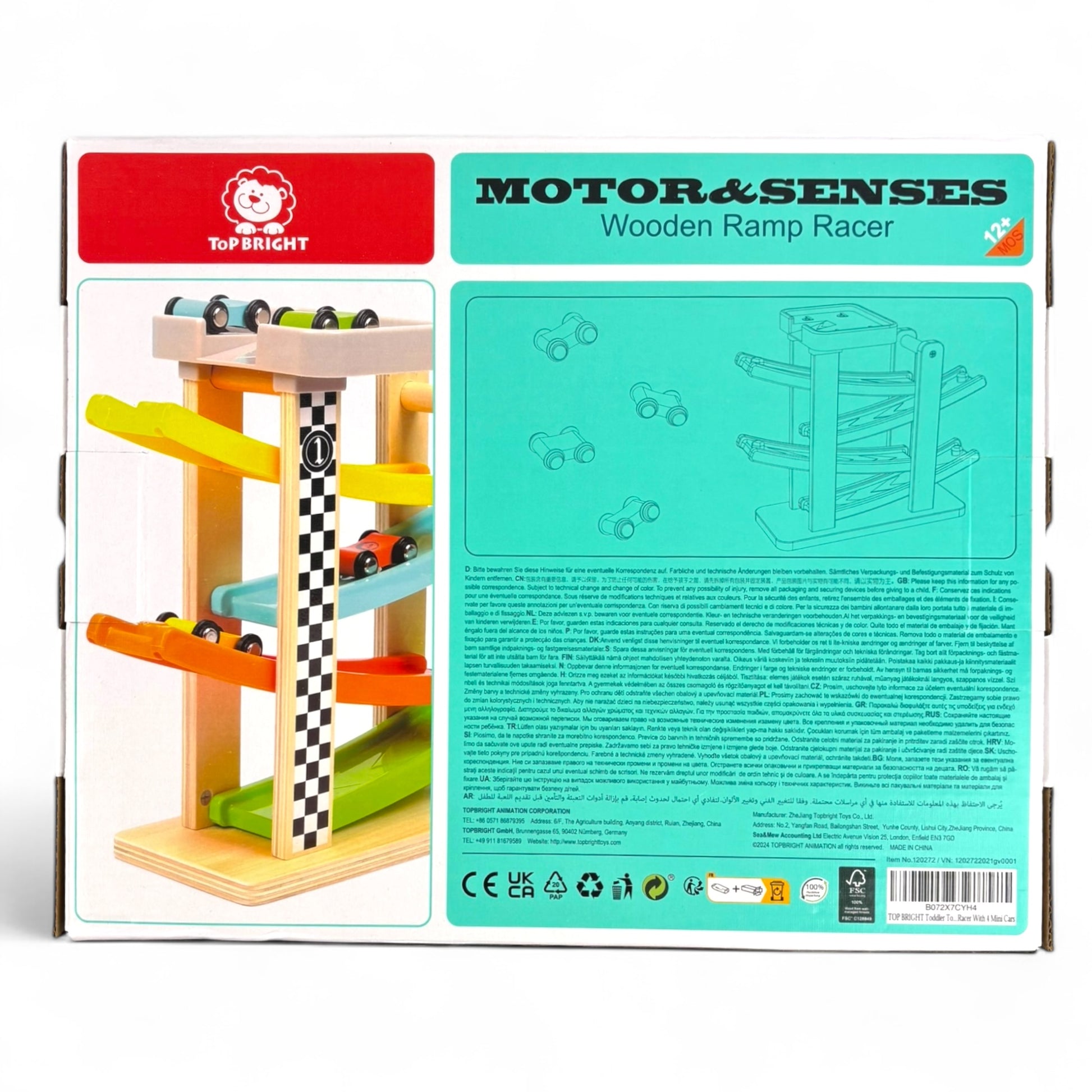 Ready, set, RACE! Send mini cars zipping down the Top Bright Wooden Race Track! This exciting ramp racer features four colorful cars for endless zooming fun. Watch them tumble and roll for hours of delightful, fast-paced play!