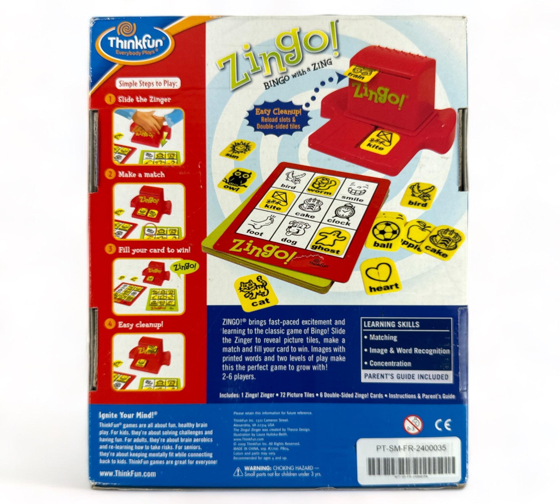 Product notes: Missing instructions and 1 tile, but is still playable. Online instructions can be found here: https://www.thinkfun.com/wp-content/uploads/2009/09/Zingo-7700-IN03.pdf